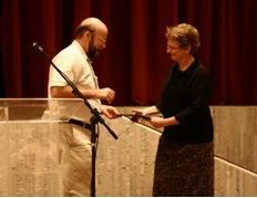 Cutline: Diana Hews, ISU associate professor of biology, accepts the Founders Award during the Animal Behavior Society annual meeting. Courtesy photo
