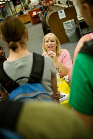http://isuphoto.smugmug.com/photos/646306686_jCd7F-L.jpg Cutline: Indiana State University Assistant Professor Maureen Johnson's health science students share with their peers information about the H1N1 virus during an event Thursday in Cunningham Memorial Library.