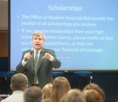 Photo: http://isuphoto.smugmug.com/Events/Interview-Day-Presidents/013109interviewday-263-of-620/466421050_xKTYR-L.jpg - Kim Donat, director of student financial aid at Indiana State University, addresses prospective students about scholarships and other forms of financial aid. ISU staff members are available to provide free help to students and families in completing the Free Application for Federal Student Aid and other financial aid matters. (ISU/Tony Campbell)