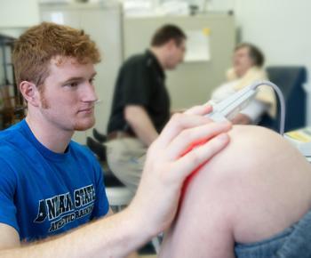 Photos: http://isuphoto.smugmug.com/photos/i-RrDDxfD/0/L/i-RrDDxfD-L.jpg - David Roos, a junior athletic training major at Indiana State University, uses laser therapy to help relieve a patient's knee pain as Timothy Demchak, associate professor of applied medicine and rehabilitation, works with another patient at St. Ann Clinic in Terre Haute. (ISU/Tony Campbell)