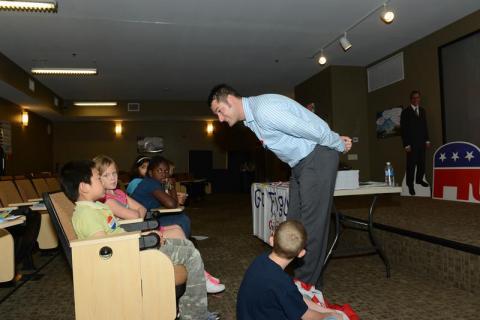 Matt Bergbower, assistant professor of political science, speaks with children about presidential qualifications. ISU Photo/Rachel Keyes
