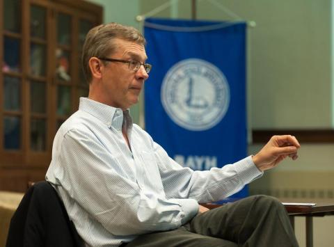 Photo: http://isuphoto.smugmug.com/Events/Chris-Kjom-Visit/i-BwwnQcJ/0/L/102512Chriskjomvisit-0046-L.jpg (ISU/Tony Campbell) Chris McGrew, director of the Office of International Programs and Services at Indiana State University, who helped organize Chris Kojm\'s recent visit to ISU.