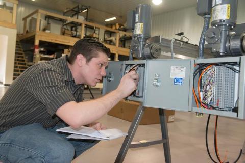 Photo: http://isuphoto.smugmug.com/Other/ISUphotoservices/AIS-Gauging-Interns/i-hftCfzT/0/L/AIS%20Guaging-7662March%2020%2C%202013-L.jpg - Indiana State University student Jeremy Kowalsky checks the wiring on equipment at AIS Gauging in Terre Haute, where he is serving an internship with the company, a client of the university\'s Business Engagement Center and the Terre Haute Innovation Alliance. (ISU/Rachel Keyes)