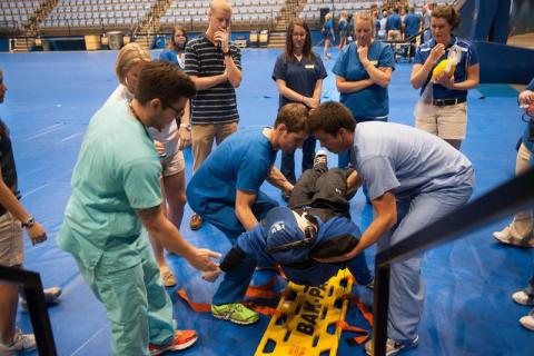 Photo: http://isuphoto.smugmug.com/Events/EMS-Event-Summer-2013/i-JKGVTH6/0/L/July%2022%2C%202013-EMS%20Event0737-L.jpg - Staff from the Rural Health Innovation Collaborative Simulation Center join Indiana State University nursing, athletic training and physician assistant studies students in treating a cheerleader who sustained a concussion in a make-shift emergency room at Hulman Center July 22, 2013. The \"cheerleader\" was a human patient simulator and the scenario was part of a training exercise with the Terre Haute Fire Department. (ISU/Rachel Keyes)