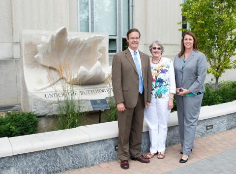 Photo: http://isuphoto.smugmug.com/Other/ISUphotoservices/Sherill-Hockemeyer/i-jdRR9Wx/0/L/08_02_13_Sherrill%20Hockemeyer%20-24-L.jpg (ISU/Tony Campbell)Scott College of Business Dean Brien Smith (left), Indiana State University alumna Sherry Hockemeyer, and Catherine Saunders, executive vice president of advancement for the ISU Foundation, near the Under the Buttonwood sculpture outside Federal Hall, which houses the Scott College. Hockemeyer\'s commitment to Indiana State has established the Business Permanent Art Collection Fund, which will be used to purchase artwork to be housed in Federal Hall.