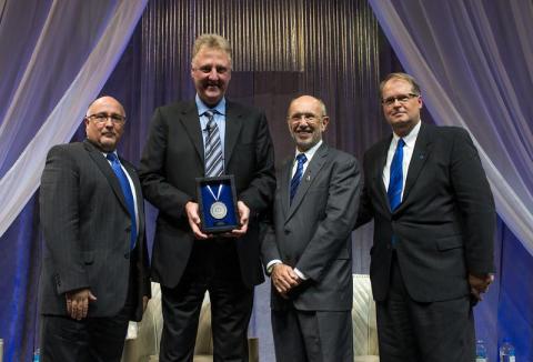 During a brief ceremony at the conclusion of the Larry Bird Scholarship Dinner Program on Nov. 8, university, ISU Foundation and Alumni Association leaders presented the basketball great with a 2013 Distinguished Alumni Award.