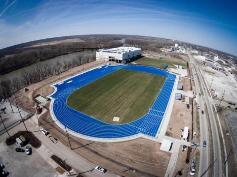 Photo: http://isuphoto.smugmug.com/Campus-Scenes/Aerial-Imagery/DJI-Phantom-Aerial-Photography/i-kvxBqqX/0/3X/04_01_15_track_construction-00400-3X.jpg - Gibson Track and Field, dedicated April 17, 2015, represents the first phase of a planned Sycamore Athletic Complex and one of the first major projects in Terre Haute\'s Riverscape.
