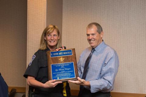 Photo: http://isuphoto.smugmug.com/Events/Events-by-Year/2015/Artz-Award-2015/… - Sgt. Brenda Edington of the Indiana State University Department of Public Safety and University Police Chief Joe Newport pose with the W. Kevin Artz Memorial Law Enforcement of the Year Award, presented to Edington by the Terre Haute Breakfast Optimist Club May 28, 2015. (ISU/Rachel Keyes)
