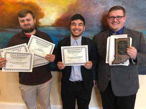 Photo: https://photos.smugmug.com/Other/Media-Services/Submitted-Photos/Staff-Uploads/i-dvGtMGH/0/f00c7598/XL/WZIS%20at%20IASB-XL.jpg -- From left, Indiana State University students Corey Clark, Victor Albaine and Landon Kleindorfer representing WZIS at the IASB awards in Carmel, Ind.